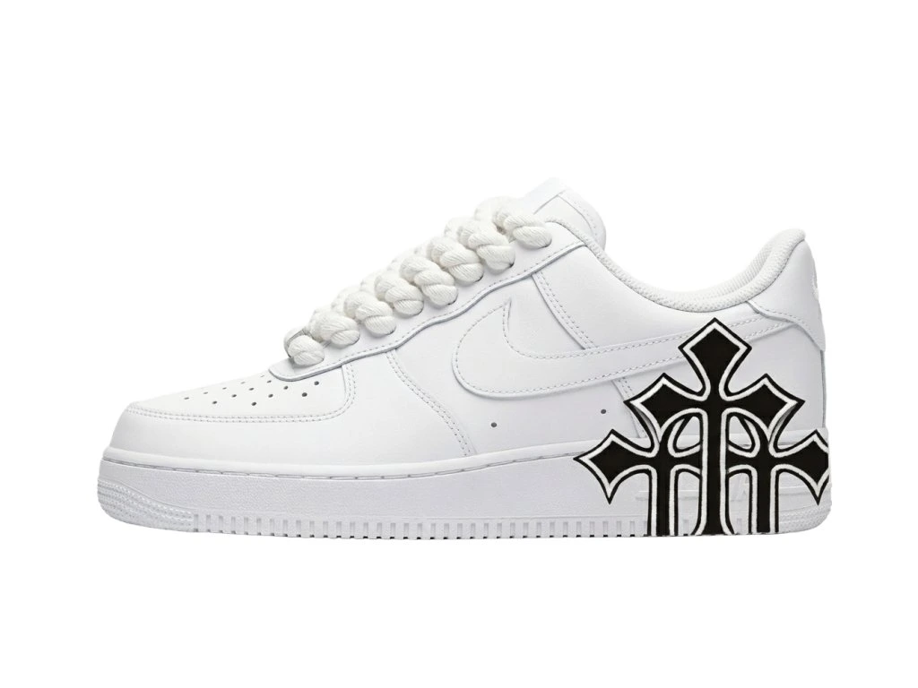 Kontrastní černý motiv na patě, inspirovaný temnou estetikou Chrome Hearts, dává těmto "jedničkám" nádech zakázaného luxusu. Je to dokonalá kombinace čistého bílého základu, drsných textur provazu a gotických linií. Každý pár je ručně laděný tak, aby splňoval nároky na exkluzivitu, kterou jinde nenajdeš. Na dripaddict.eu ti přinášíme tenhle monochromatický klenot, který se hodí ke každému outfitu, ale přitom dává jasně najevo, že víš, co je to skutečný drip.